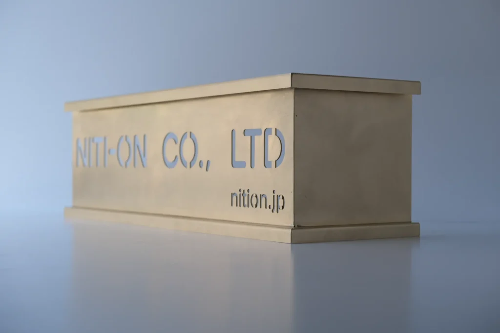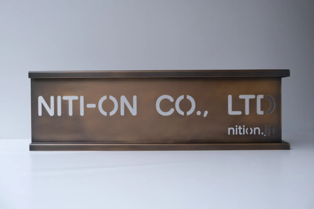 富士産業では、薄板真鍮の切断から仕上げまでを一貫して行い、文字形状のシャープさと素材感の両立を実現しています。特に小さな文字や細い線を含むデザインでは、加工難易度が高くなりますが、意匠性を損なわないよう細部まで調整を行います。