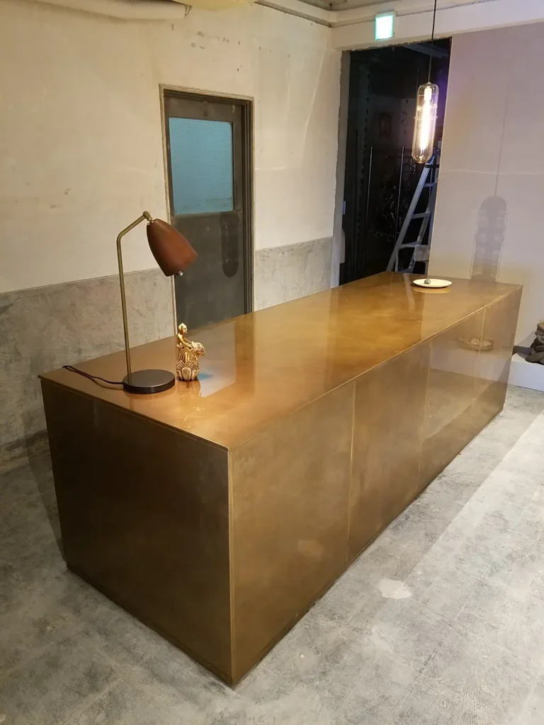 エイジング加工を施した真鍮カウンターは、単なる装飾ではなく、空間の一部としての説得力を持ちます。例えば、ヴィンテージ調のバーや、歴史を感じさせるホテルラウンジでは、深みのある色味が空間全体のトーンを引き締めます。