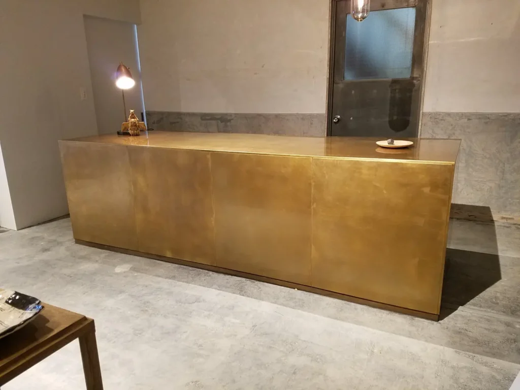 特にバーカウンターでは、トップ面に触れる機会が多いため、使い込まれることで生まれる“アタリ”や色味の変化が、その店だけの表情として蓄積されていきます。これは、木材や石材にはない、金属ならではの価値です。時間の経過が空間の歴史として刻まれていく点に、真鍮カウンターの魅力があります。